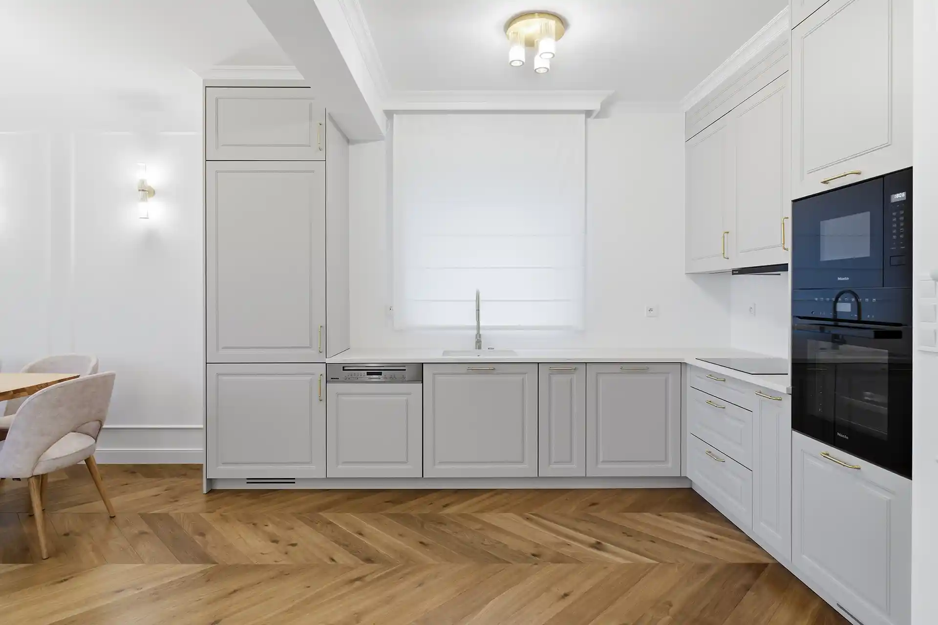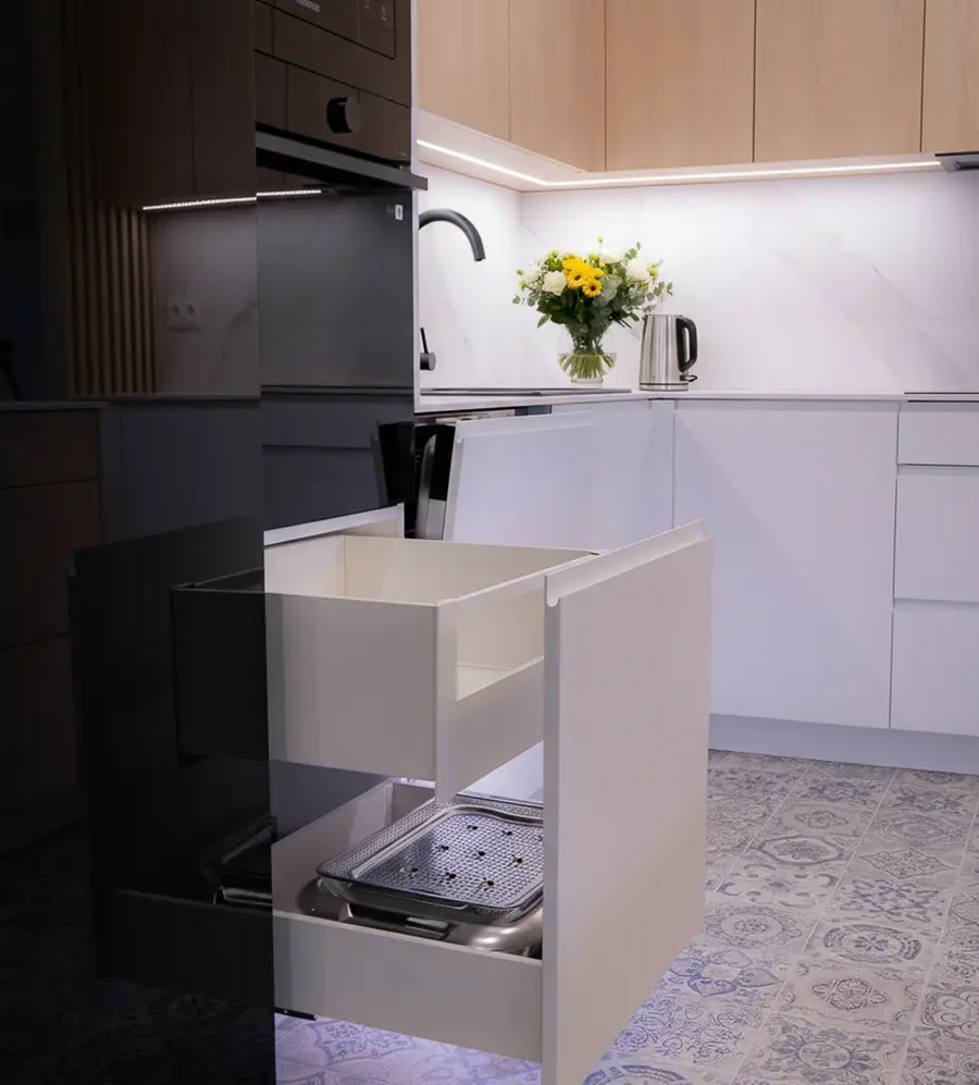 Dobieramy wysokości blatów, rodzaje szafek, systemy koszy i cargo do Twojego wzrostu i przyzwyczajeń. Dbamy o to, żeby to, czego używasz najczęściej, było pod ręką, a rzadziej używane rzeczy nie zabierały miejsca w najważniejszych strefach.