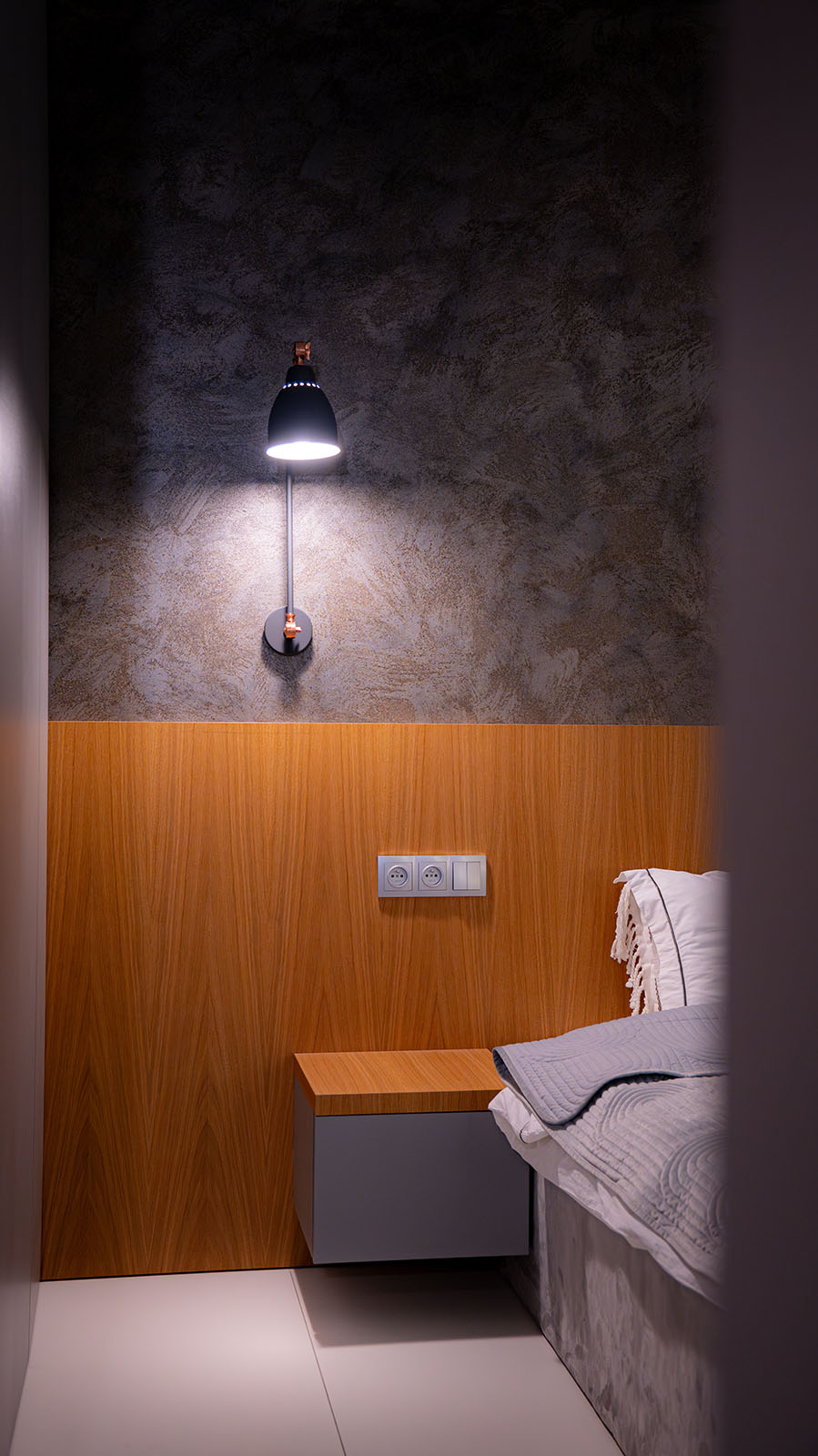 Projekt mieszkania łączący wyraziste, industrialne akcenty z przytulną, domową atmosferą. Surowość form została przełamana drewnem, metalem, miękkimi tkaninami i ciepłym oświetleniem, tworząc nowoczesne, ale przyjazne wnętrze o wyraźnym charakterze.