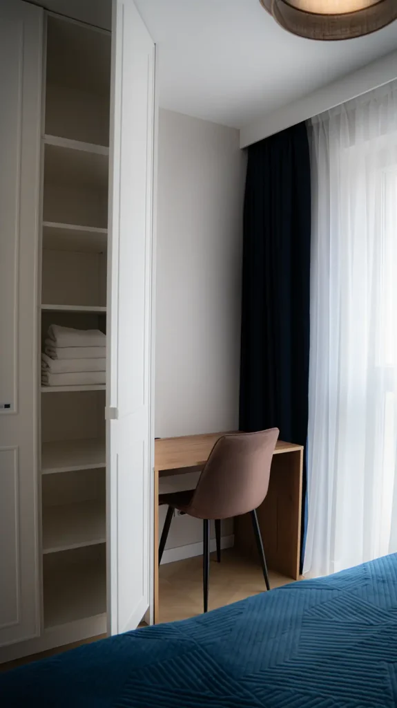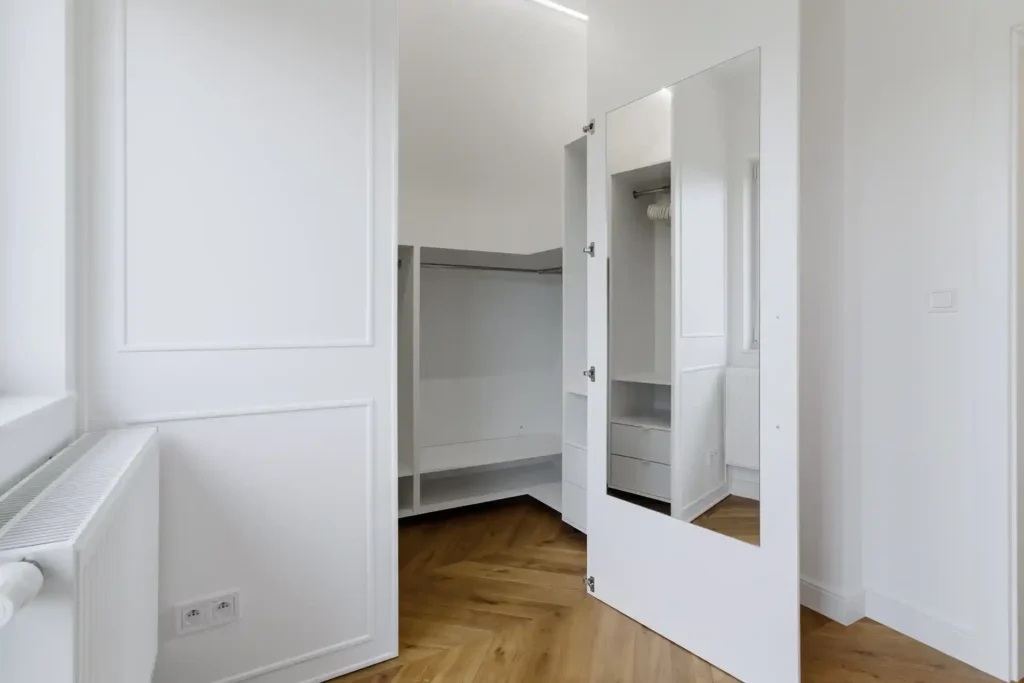 Zwracamy uwagę na układ pomieszczenia, szerokość przejść i sposób otwierania frontów. Dzięki temu szafa nie tylko “się zmieści”, ale rzeczywiście poprawi funkcjonalność wnętrza.
